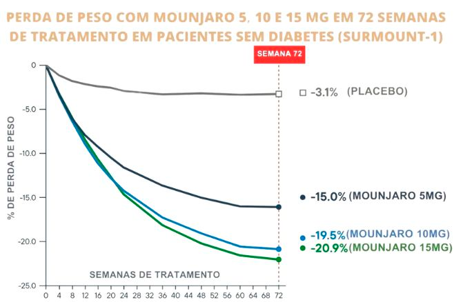 No estudo SURMOUNT-1, que envolveu 2.539 adultos com sobrepeso ou obesidade sem diabetes, os participantes que usaram Tirzepatida apresentaram uma perda de peso significativa em comparação com o placebo após 72 semanas, confira abaixo: